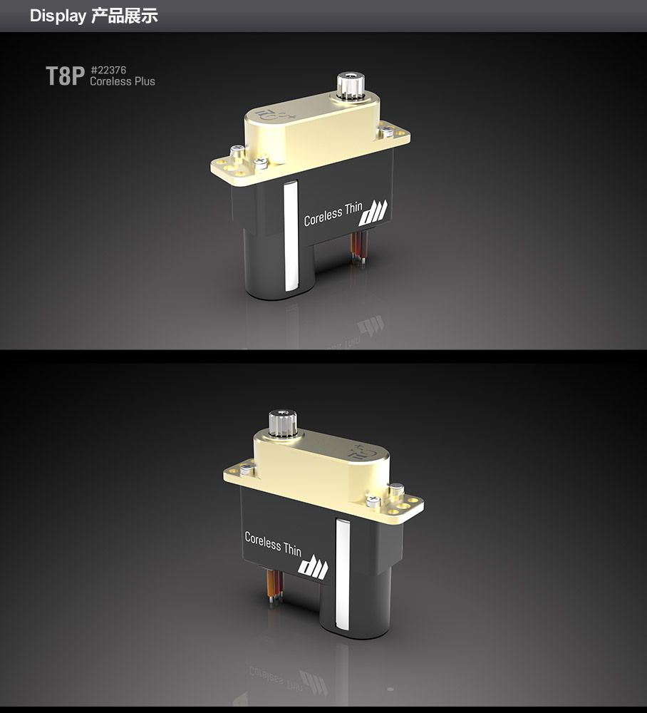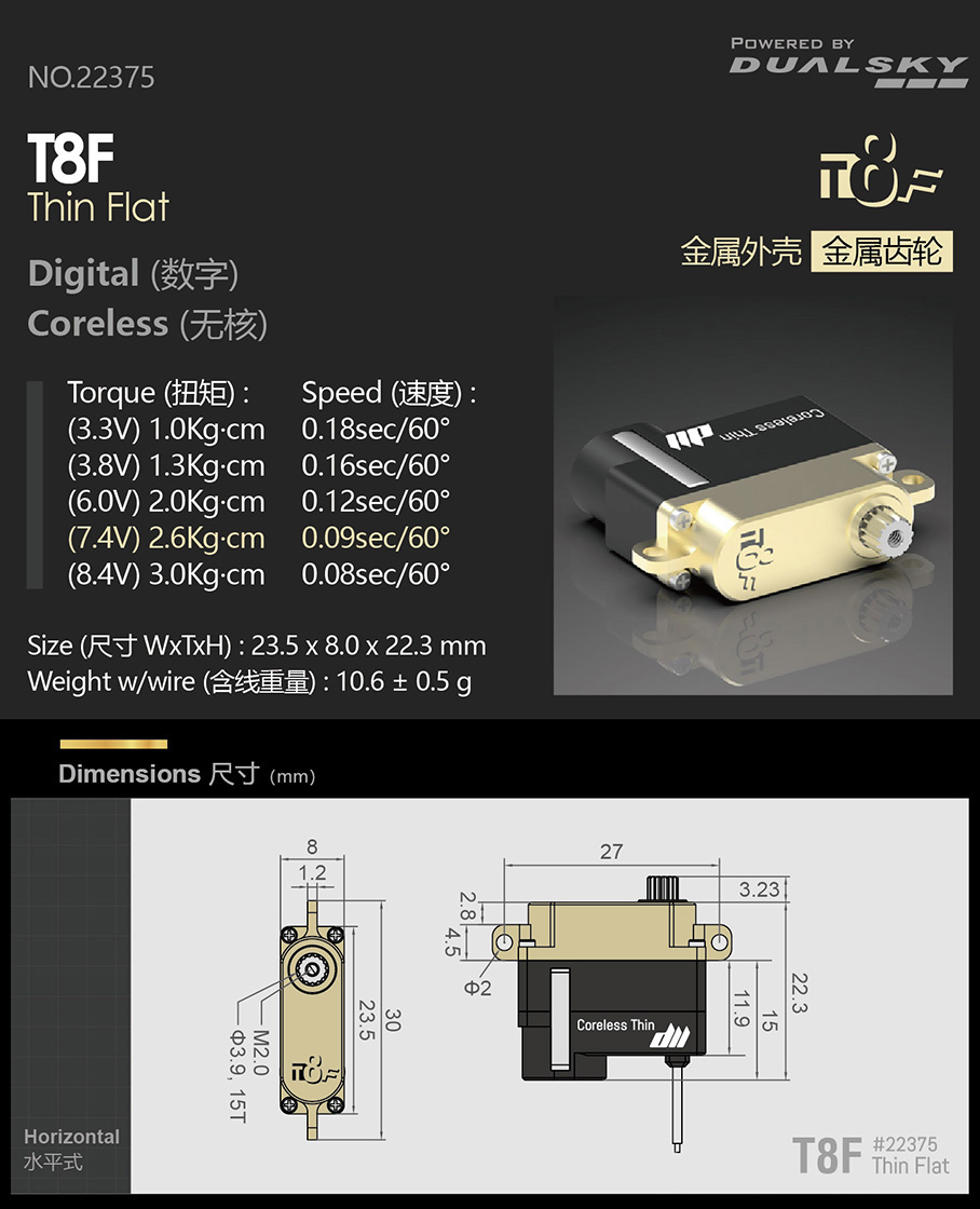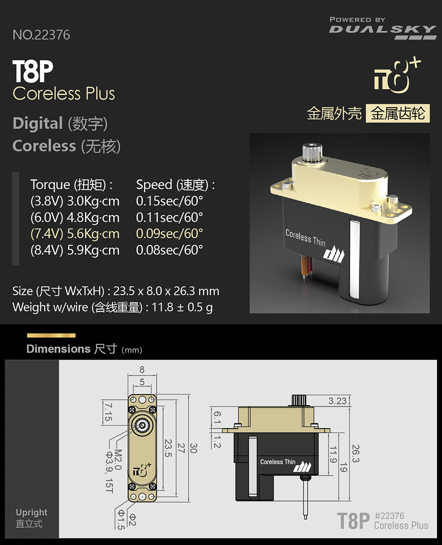 (3.8V) 3.0 Kg·cm, 0.15 sec/60° (6.0V) 4.8 Kg·cm, 0.11 sec/60° (7.4V) 5.6 Kg·cm, 0.09 sec/60° (8.4V) 5.9 Kg·cm, 0.08 sec/60° |