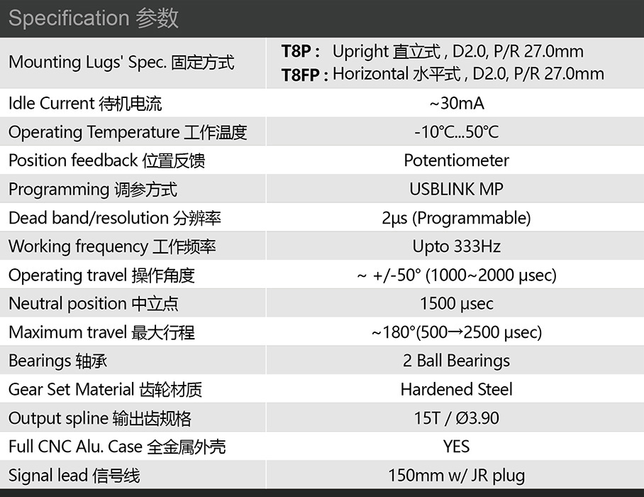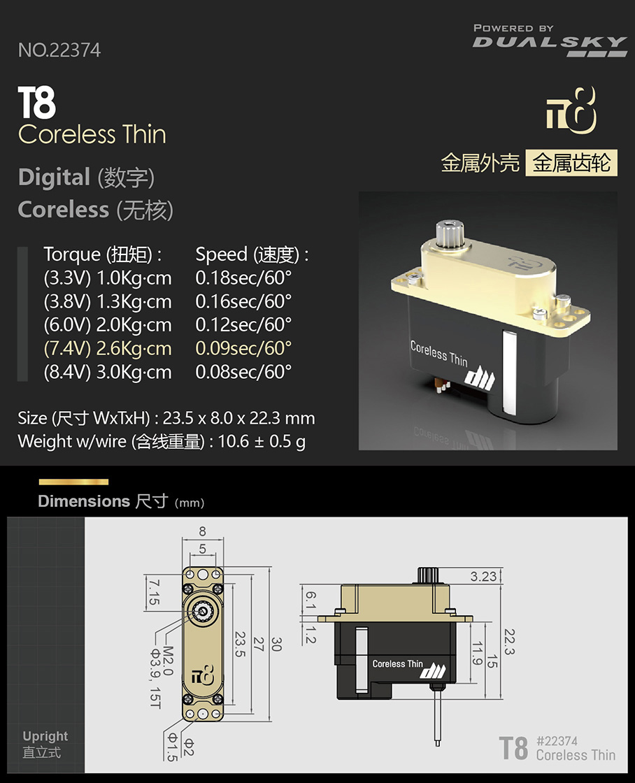 (3.8V) 3.0 Kg·cm, 0.15 sec/60° (6.0V) 4.8 Kg·cm, 0.11 sec/60° (7.4V) 5.6 Kg·cm, 0.09 sec/60° (8.4V) 5.9 Kg·cm, 0.08 sec/60° |